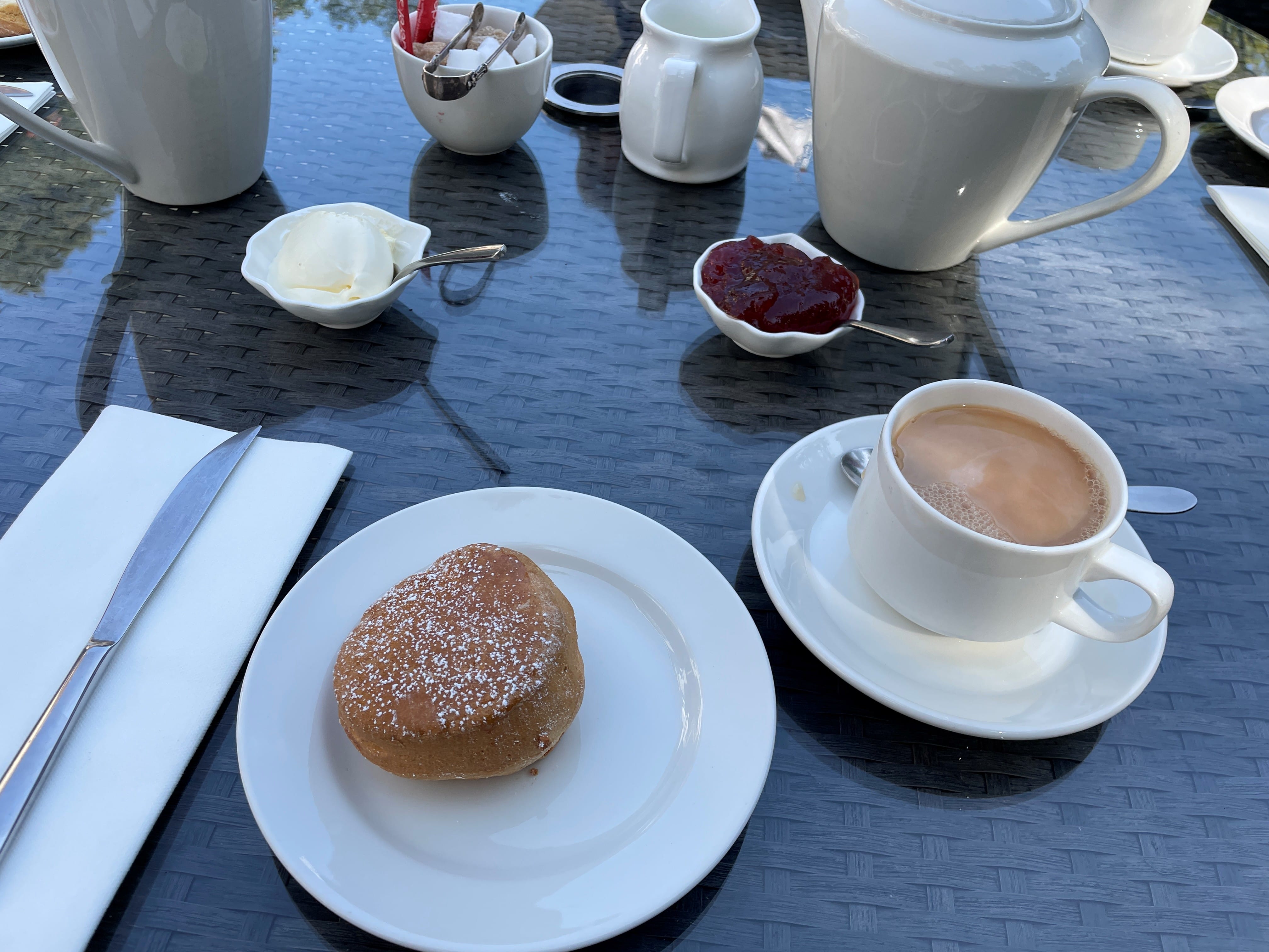 Zum Abschluss des Tages halten wir im Hafenörtchen Rozel, wo wir einen traditionellen Cream Tea mit Scones, Schlagrahm und Tee geniessen dürfen.