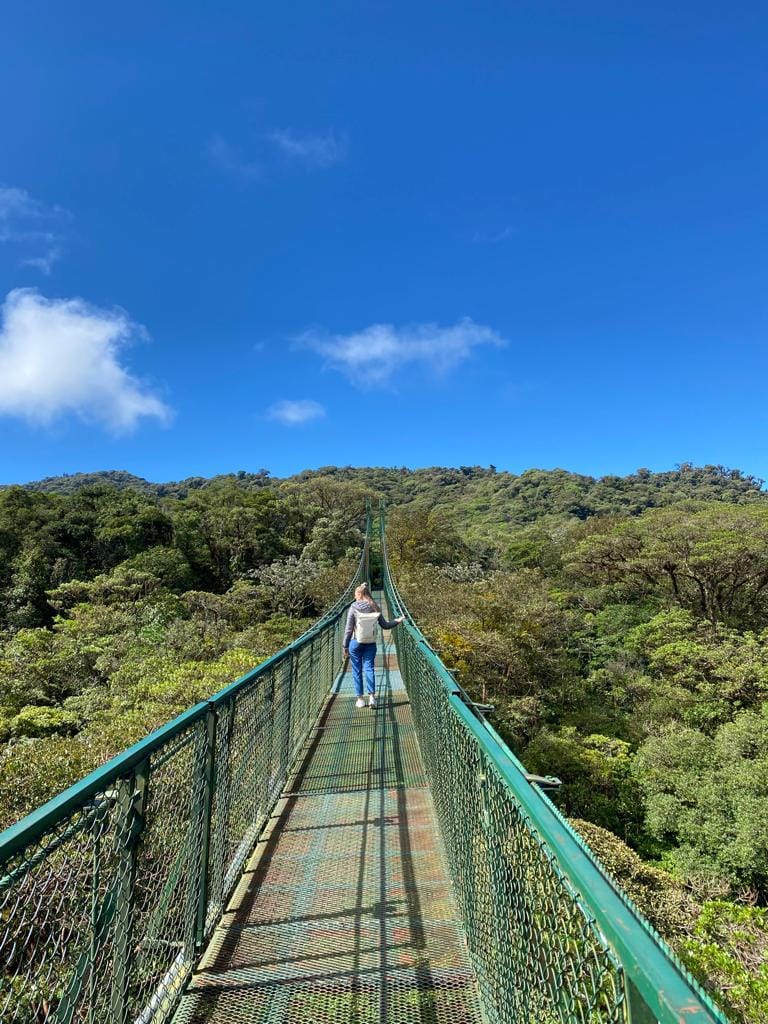 Schwindelfrei zu sein ist für den heutigen Tag ein grosser Vorteil. Wir wandern über acht verschiedene Hängebrücken durch die unberührte Natur. Auch an diesem Tag haben wir Glück: Wir sind fast alleine dort, geniessen die Ruhe und konzentrieren uns auf die Geräusche, die aus dem Nebelwald dringen. Zwischen den Baumkronen schwingen sich geschickt ein paar Affen hin und her.