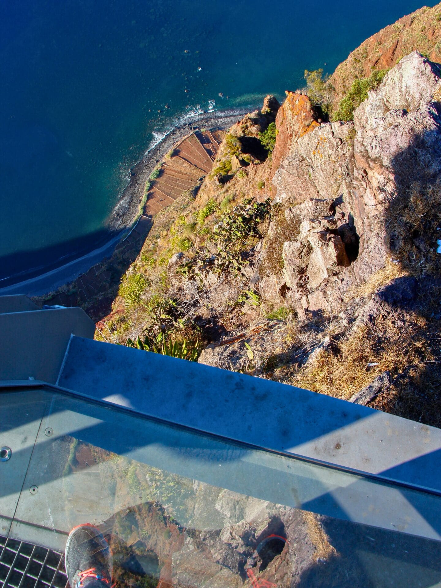 An der Küste hatten wir mehr Wetterglück. Rund um die Insel ist sie geprägt von steilen Felsen und atemberaubenden Ausblicken. Einer der spektakulärsten Orte ist das westlich von Funchal gelegene Cabo Girão, mit 580 m die höchste Steilklippe Europas. Als wäre die Lage allein nicht schon eindrücklich genug, bauten die Madeirer dort eine Aussichtsplattform mit Glasboden, wodurch die schwindelfreien Besucher direkt in den Abgrund blicken können.