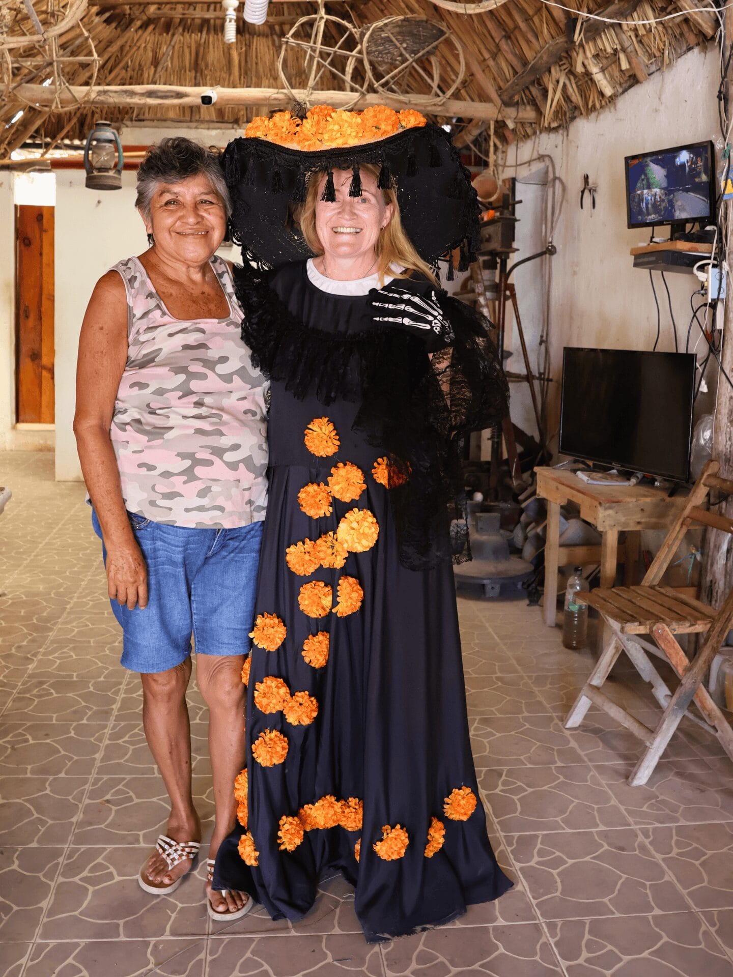 Während die einen Reiseteilnehmer das Angebot im Laden studieren und einige Produkte den Besitzer wechseln, stöbern andere noch ein wenig durch den Showroom. Da taucht Doña Chari unverhofft mit ihrem «Catrina-Kostüm» auf, welches sie tags zuvor am lokalen Umzug zu Ehren der Toten trug. Kurzerhand fordert sie eine Reiseteilnehmerin auf, das Kleid anzuziehen. Die Augen der beiden Frauen leuchten – was für ein Erlebnis!