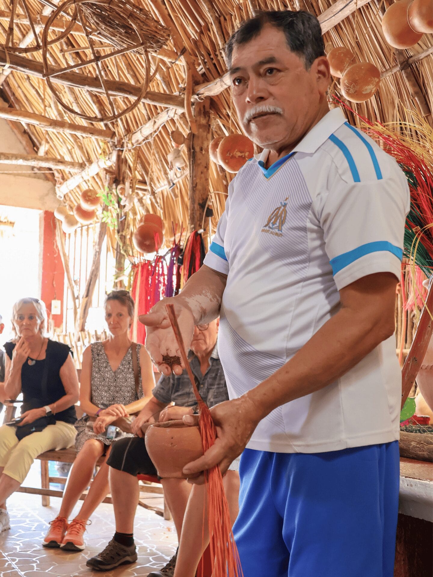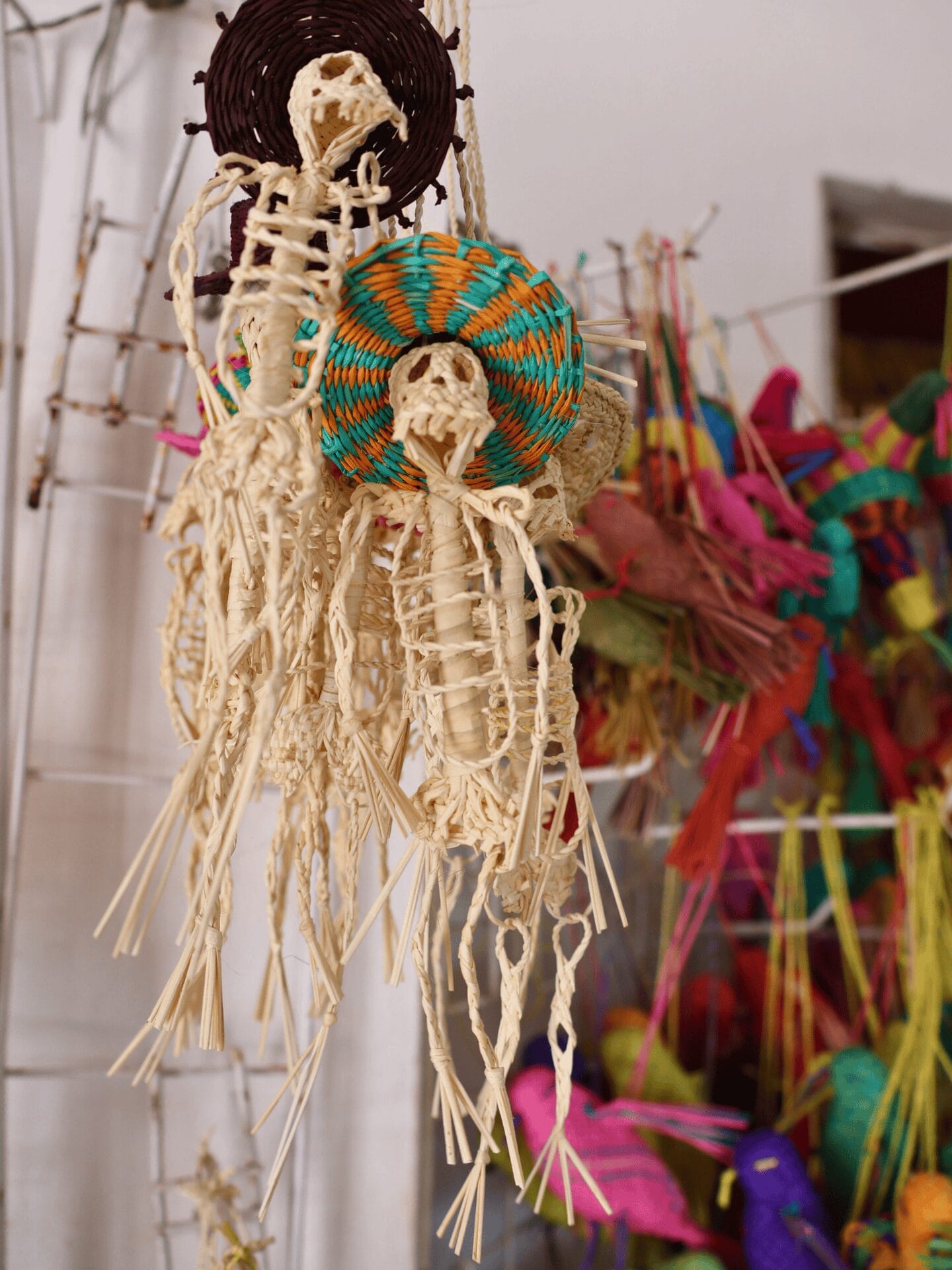 Schon beim Betreten ihres Hauses fallen die Strohhüte in allen möglichen Formen und Farben auf. Auch Portemonnaies, Untersetzer, Armbänder und – passend zum «Día de Muertos» (Allerseelen) – kleine Skelette bietet Doña Chari in ihrem Laden feil. Der Showroom gleicht einem kleinen Museum: ein Fächer hier, eine Tasche da und versteck lugt neckisch eine kleine Figur vom Strohdach zu den Besuchern hinunter.